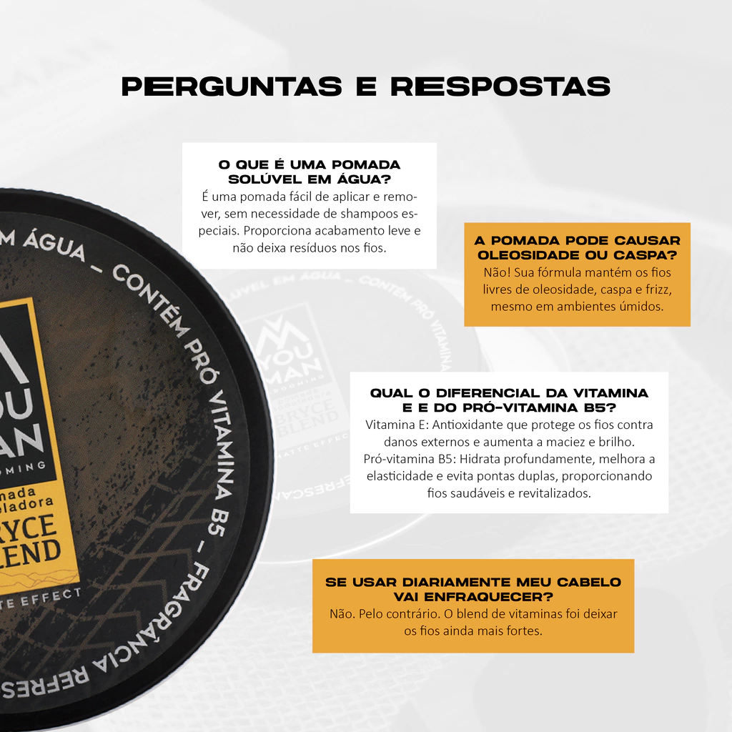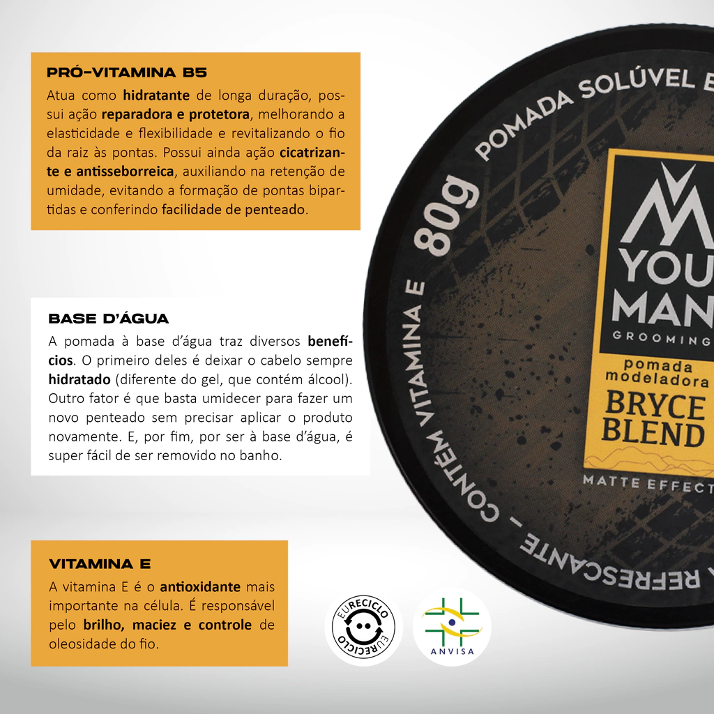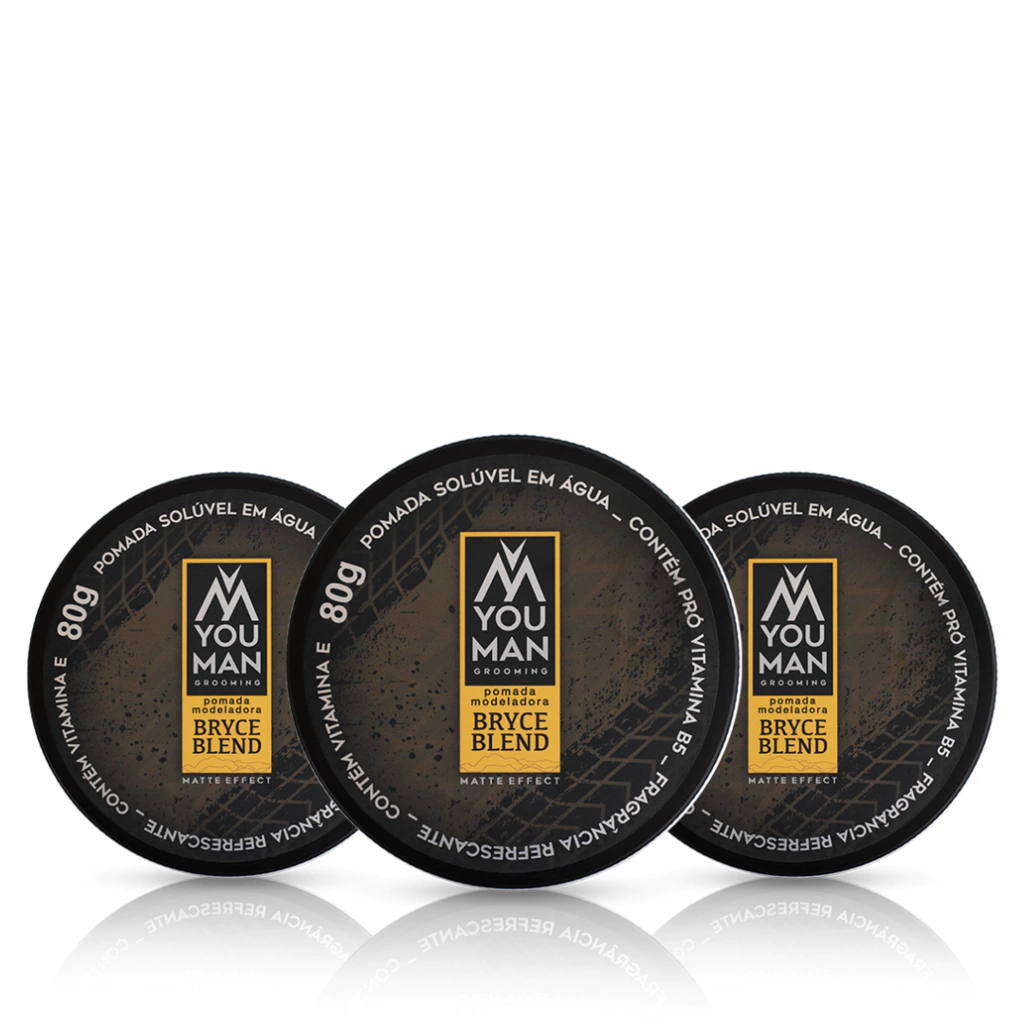 O modelador capilar da linha Bryce Blend combina força, estilo e uma fragrância herbal e refrescante. Criada para o homem moderno, oferece fixação média/forte, efeito matte e é solúvel em água, com a qualidade da linha You Man Grooming.