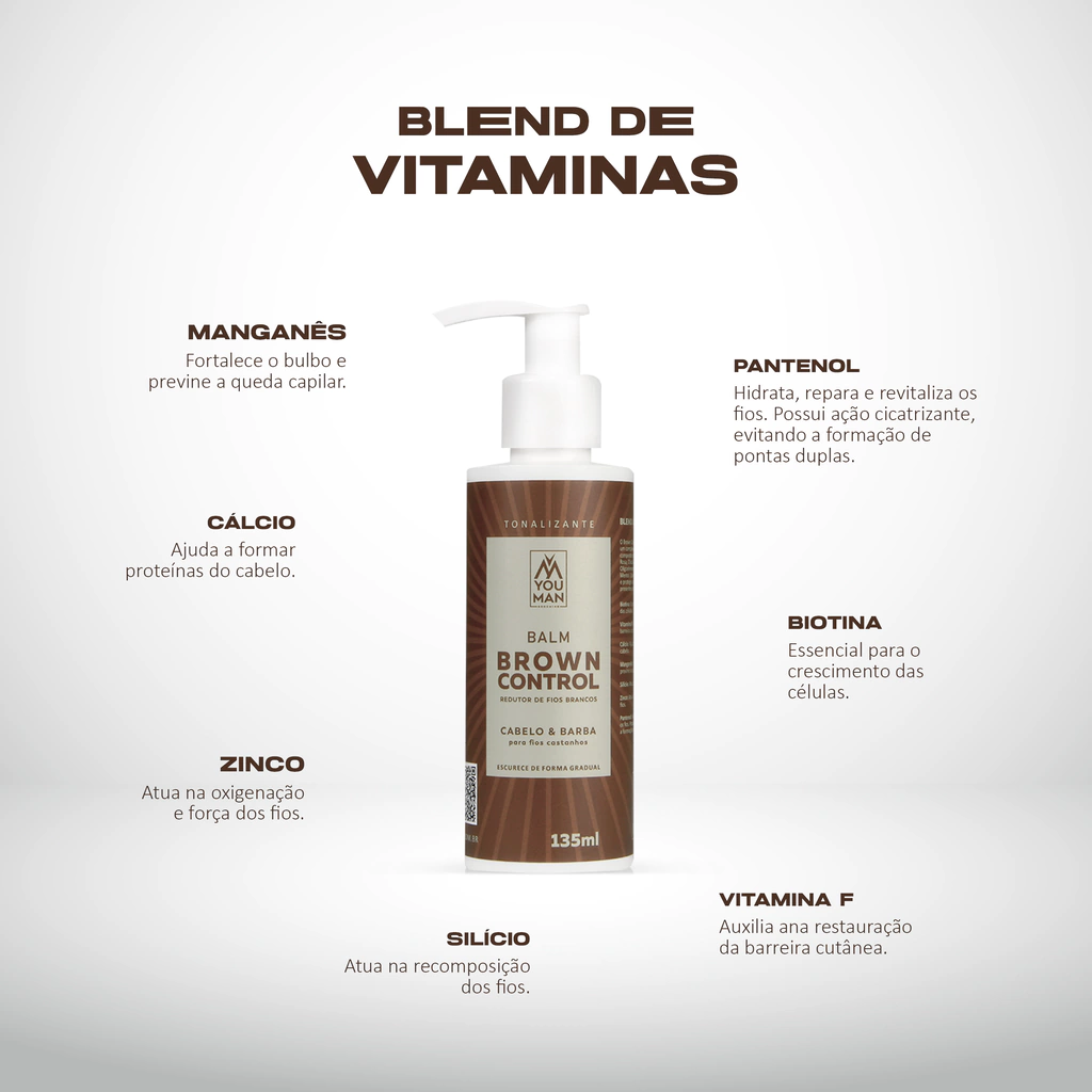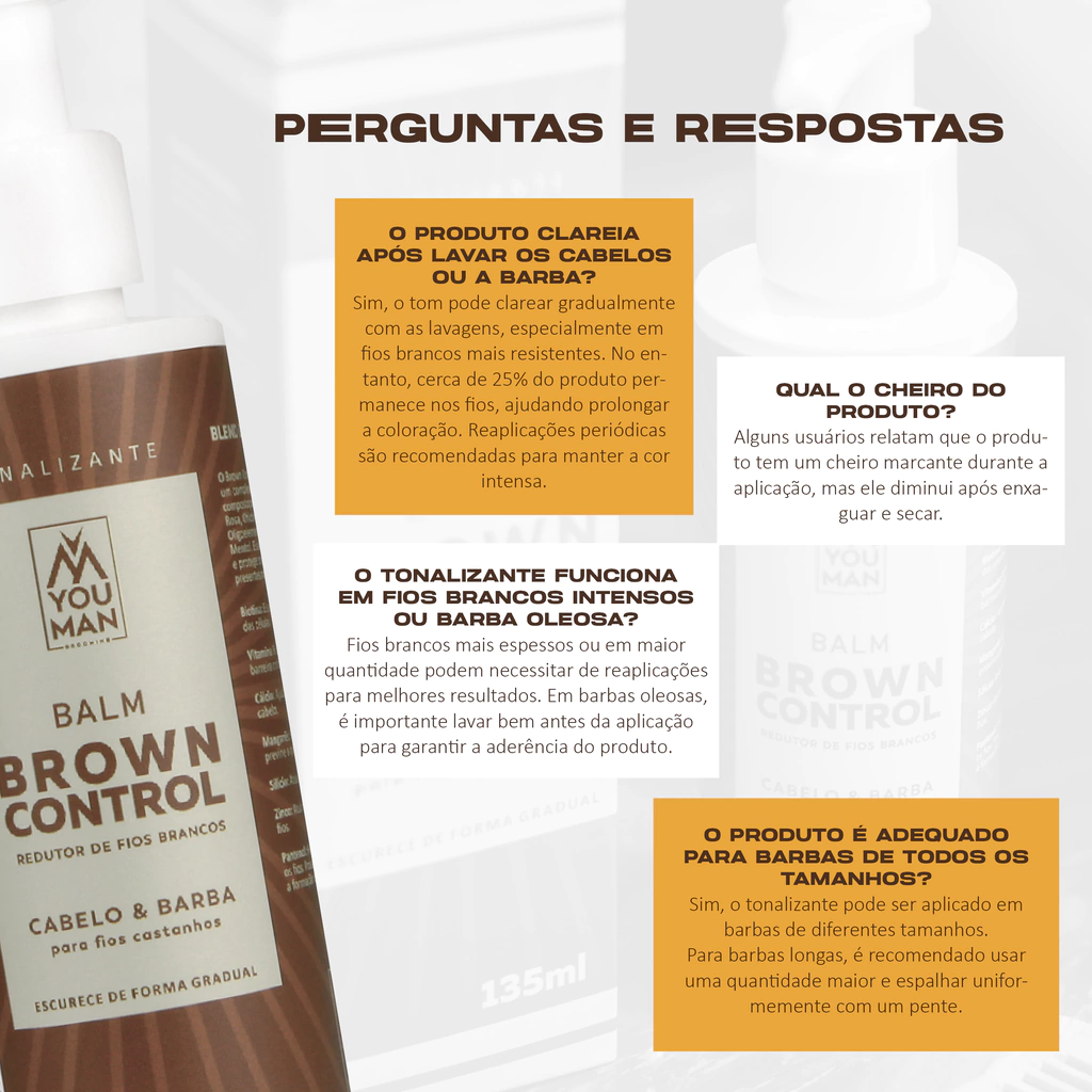 O Brown Control é um balm tonalizante, que escurece os fios brancos de forma gradual, proporcionando uma aparência natural e rejuvenescida a cada uso. E o melhor: você tem total controle sobre o nível de escurecimento que deseja. Quanto mais usar, mais escuros os fios ficam. Serve para cabelo e também para barba.