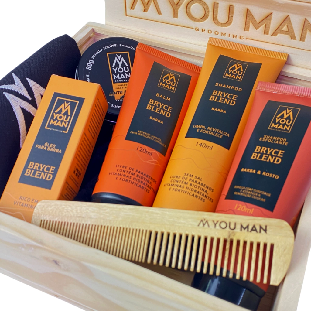 Esse kit contém sete produtos essenciais para o cuidado com a barba e o cabelo. Os produtos vão dentro de uma caixa de madeira exclusiva You Man